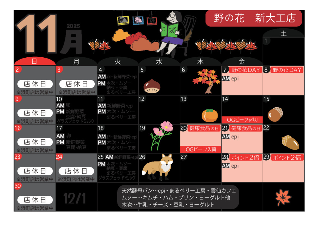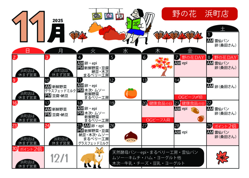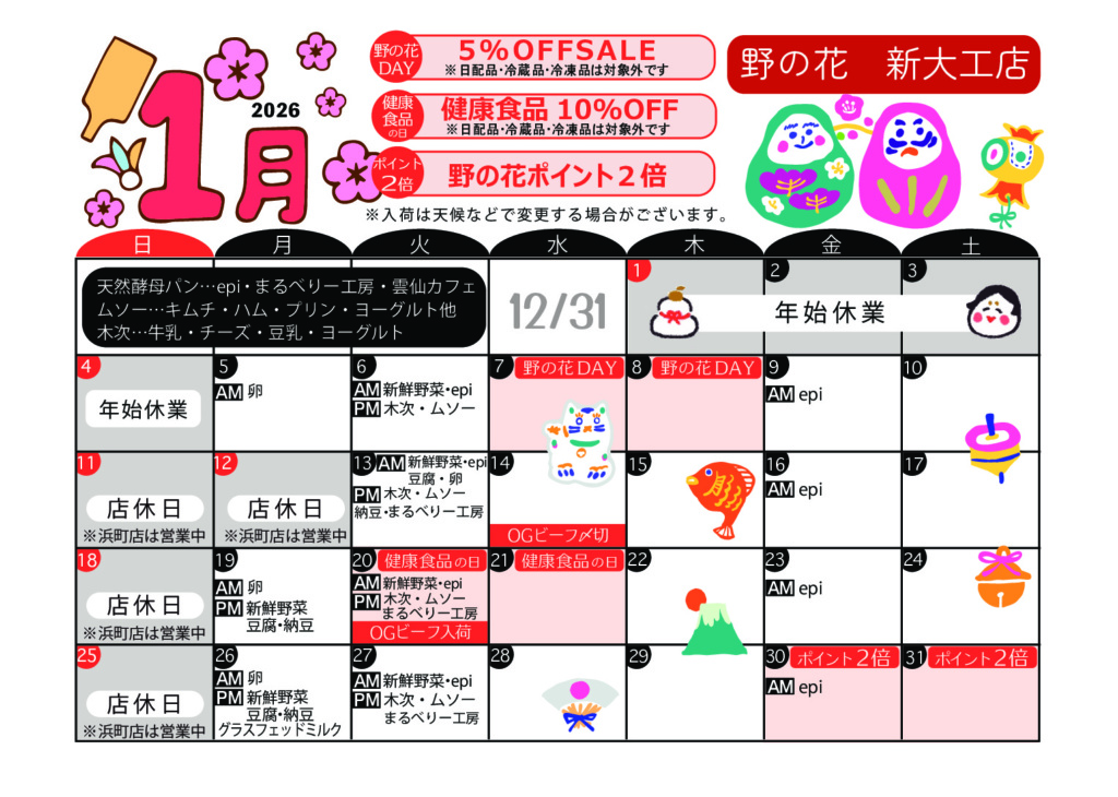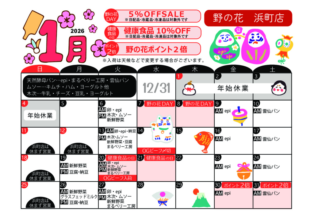 入荷イベント情報 DAILY 生産者様から直送の新鮮卵、天然酵母パン、また、乳製品や豆腐、有機野菜など日替わりで入荷いたします。大人気の天然酵母パンは、それぞれ生産者さんの個性があふれ、バリエーションも豊か。きっとお気に入りに出会えますよ。 店舗によって入荷日が異なりますので、各店舗のカレンダーでご確認ください。 今月のカレンダー 各カレンダーをクリックすると、PDFで表示されます 浜町店 新大工店 住吉店