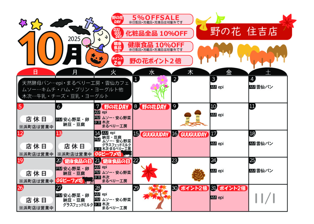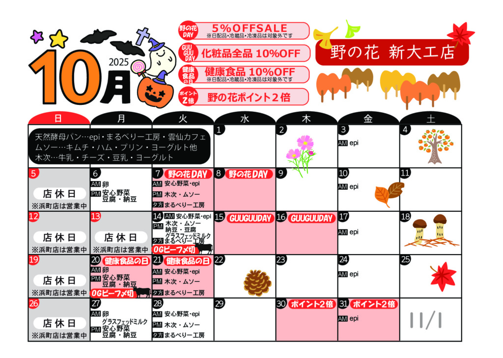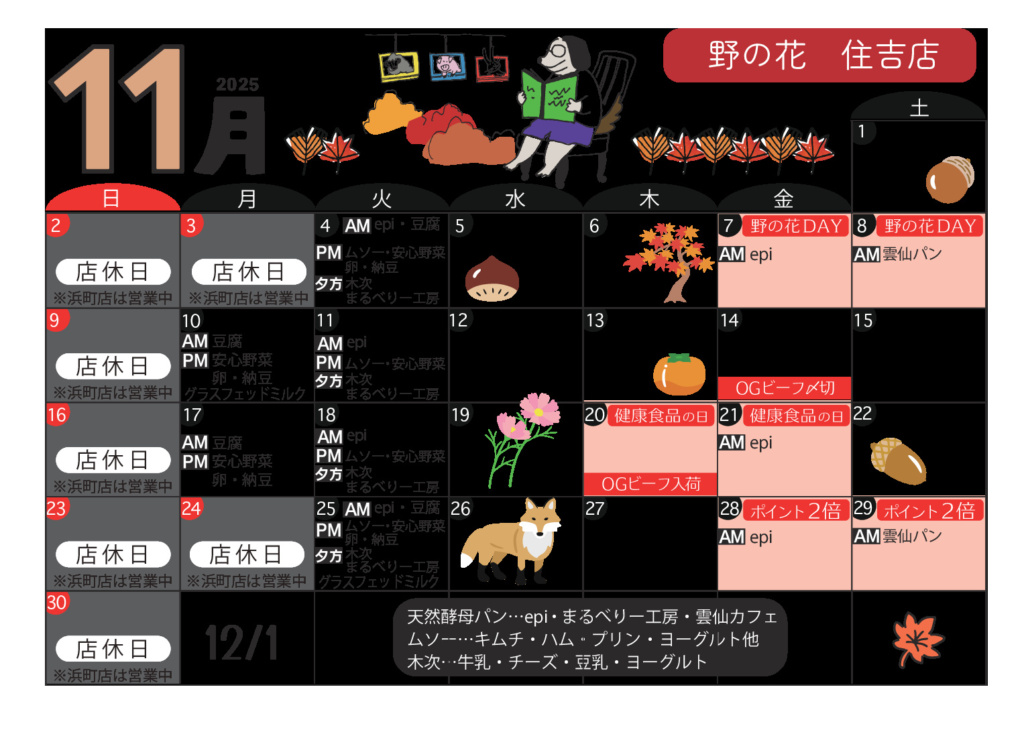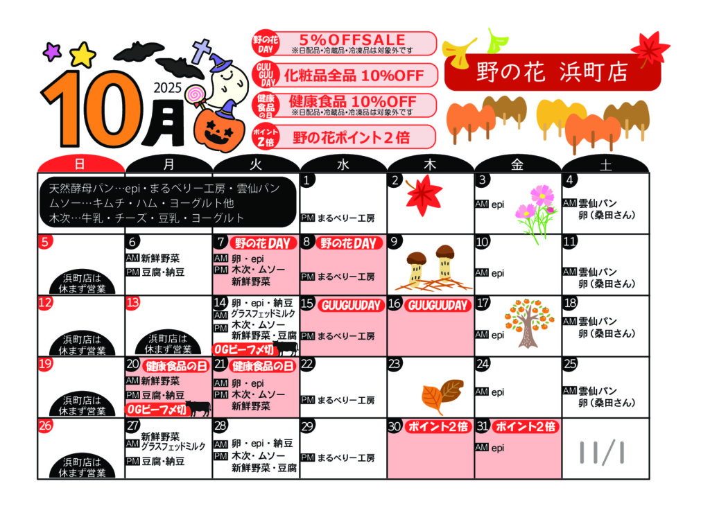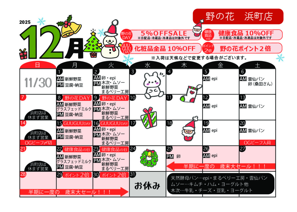 入荷イベント情報 DAILY 生産者様から直送の新鮮卵、天然酵母パン、また、乳製品や豆腐、有機野菜など日替わりで入荷いたします。大人気の天然酵母パンは、それぞれ生産者さんの個性があふれ、バリエーションも豊か。きっとお気に入りに出会えますよ。 店舗によって入荷日が異なりますので、各店舗のカレンダーでご確認ください。 今月のカレンダー 各カレンダーをクリックすると、PDFで表示されます 浜町店 新大工店 住吉店